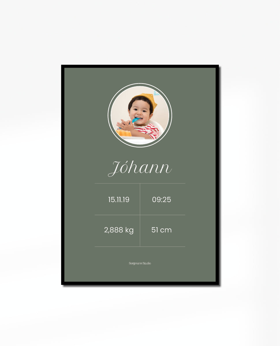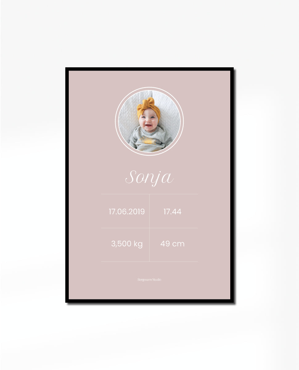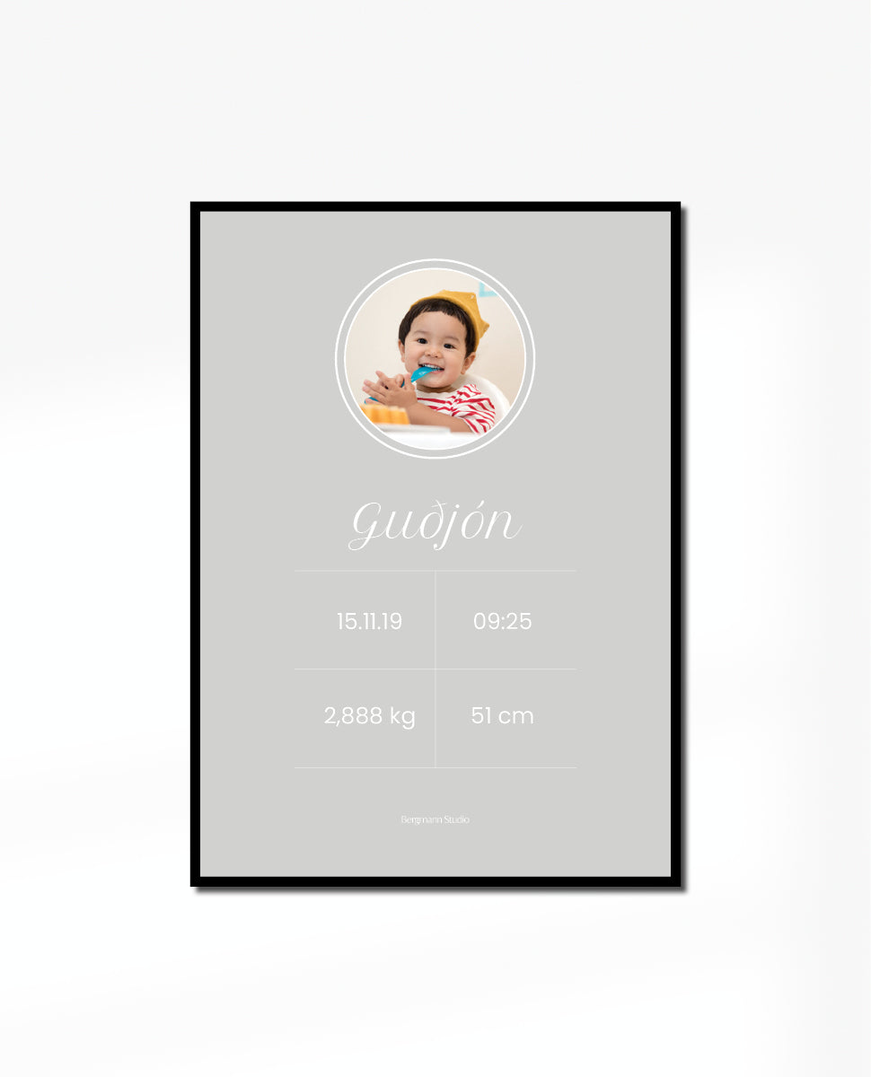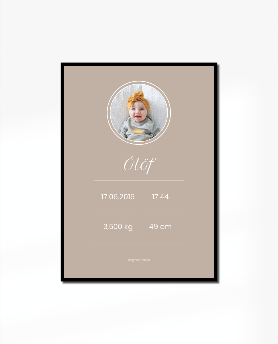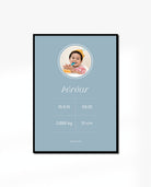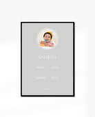Modern & simple birth poster design with image of the child in a circle above the image. This poster is ideal baptism present with the birth information that would be perfect to place it in the nursery or the baby's bedroom.