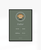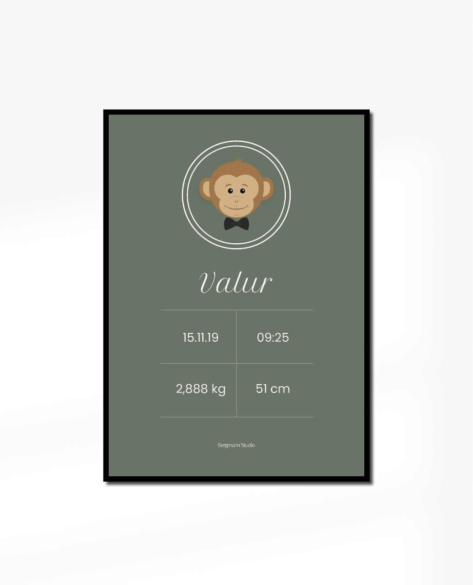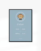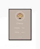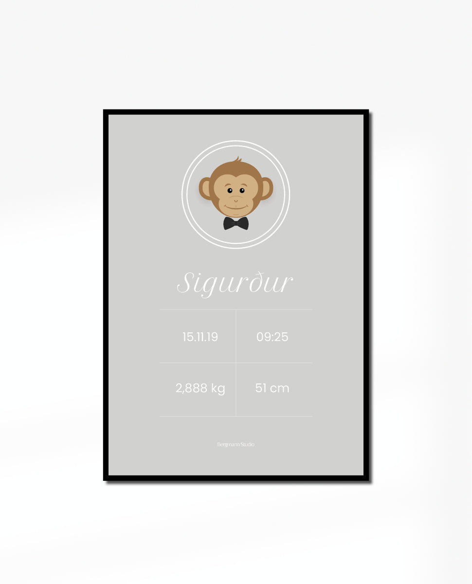 Modern & simple birth poster design with monkey with bow tie illustration. This poster is ideal baptism present with the birth information that would be perfect to place it in the nursery or the baby's bedroom.