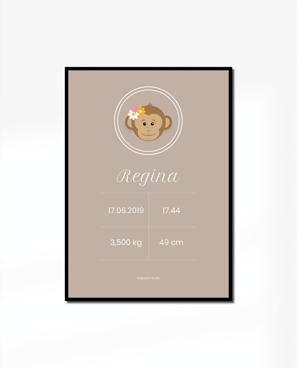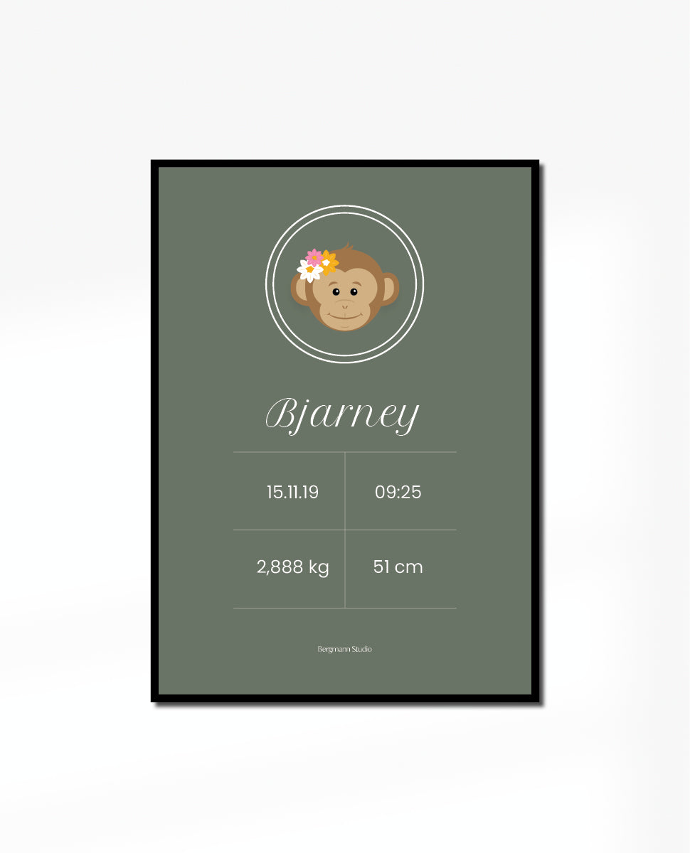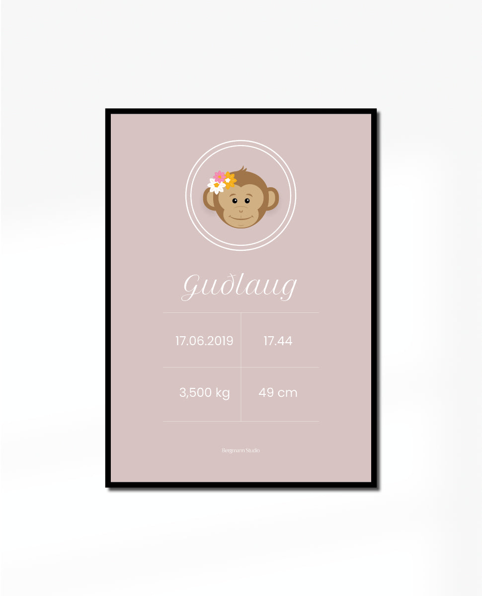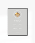 Modern & simple birth poster design with monkey with flowers illustration. This poster is ideal baptism present with the birth information that would be perfect to place it in the nursery or the baby's bedroom.