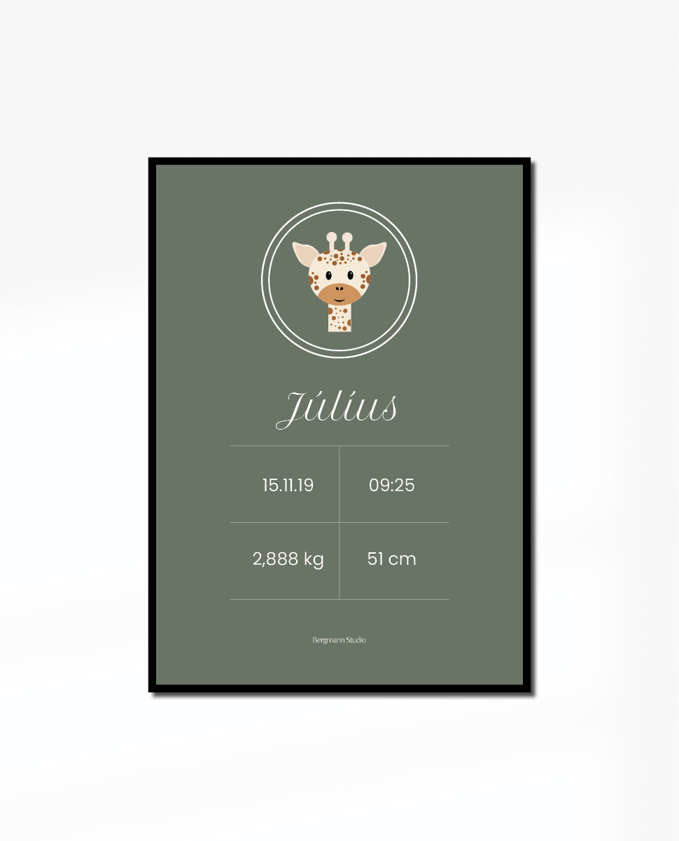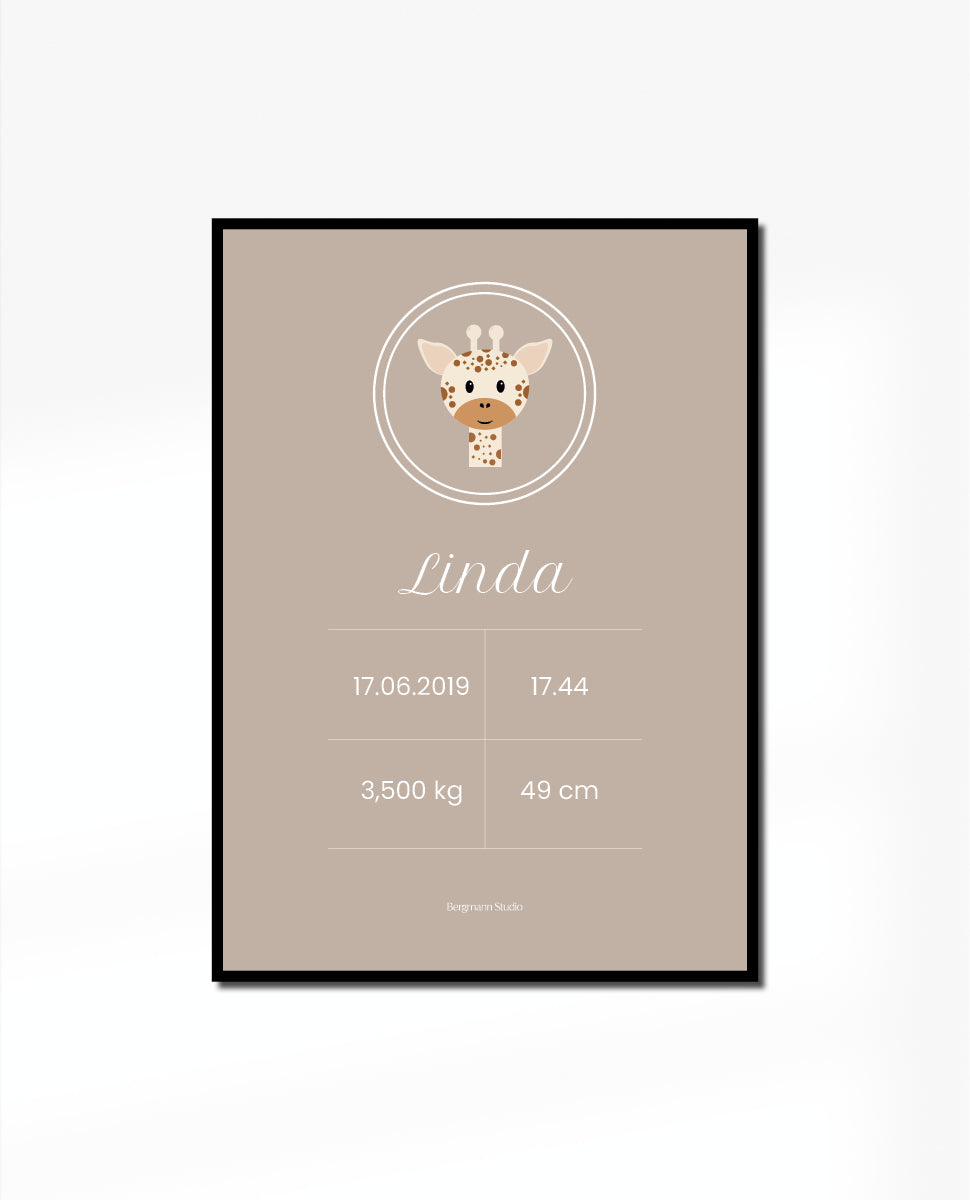 Cute birth poster design with giraffe illustration. This poster is ideal baptism present with the birth information that would be perfect to place it in the nursery or the baby's bedroom.
